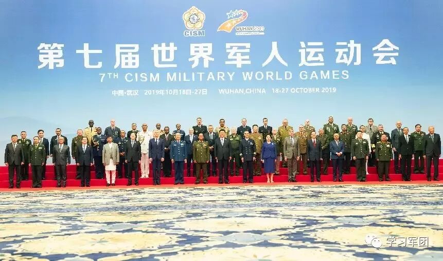 习近平同出席第七届世界军人运动会开幕式的各国防务部门和军队领导人及国际军事体育理事会主要官员合影。