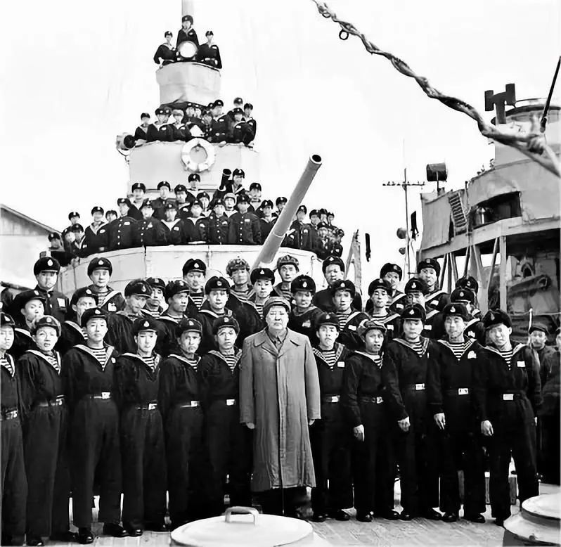1953年2月20日,武汉长江上,毛泽东在“长江舰”上和海军指战员们合影,这是毛泽东第一次视察海军舰艇部队。