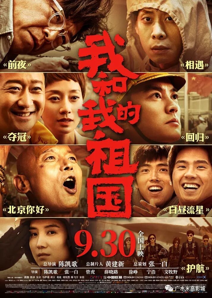 《我和我的祖国》《我和我的祖国》是由陈凯歌、张一白、管虎、薛晓路、徐峥、宁浩、文牧野联合执导,由《夺冠》、《回归》、《前夜》、《相遇》、《护航》、《北京你好》、《白昼流星》7个短片组合串联为一部电影。于2019年9月30日在中国大陆上映。