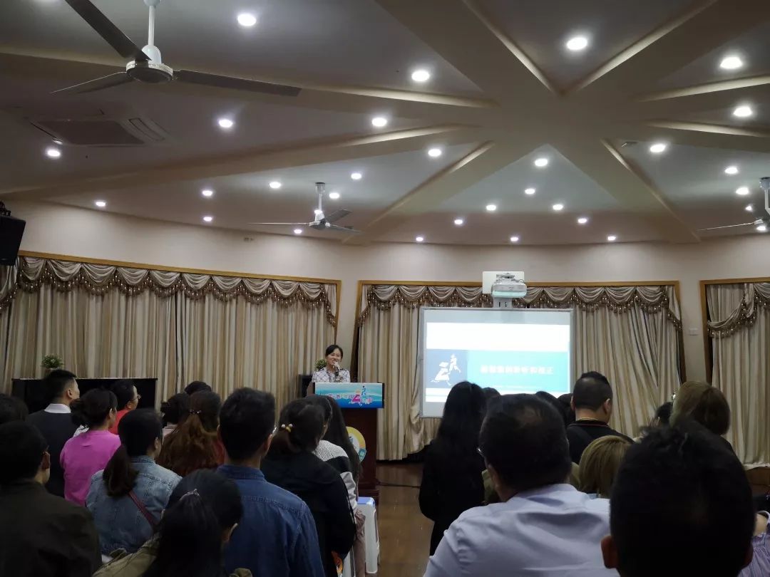 ,家长们聚集在音乐厅中,刘倩副园长通过图文并茂的PPT向家长们简单介绍幼儿园的发展情况、园区环境、区域分布、师资力量、以及园本特色课程。
