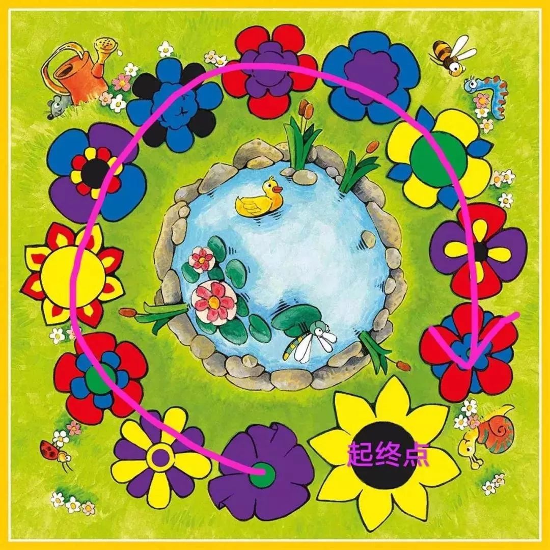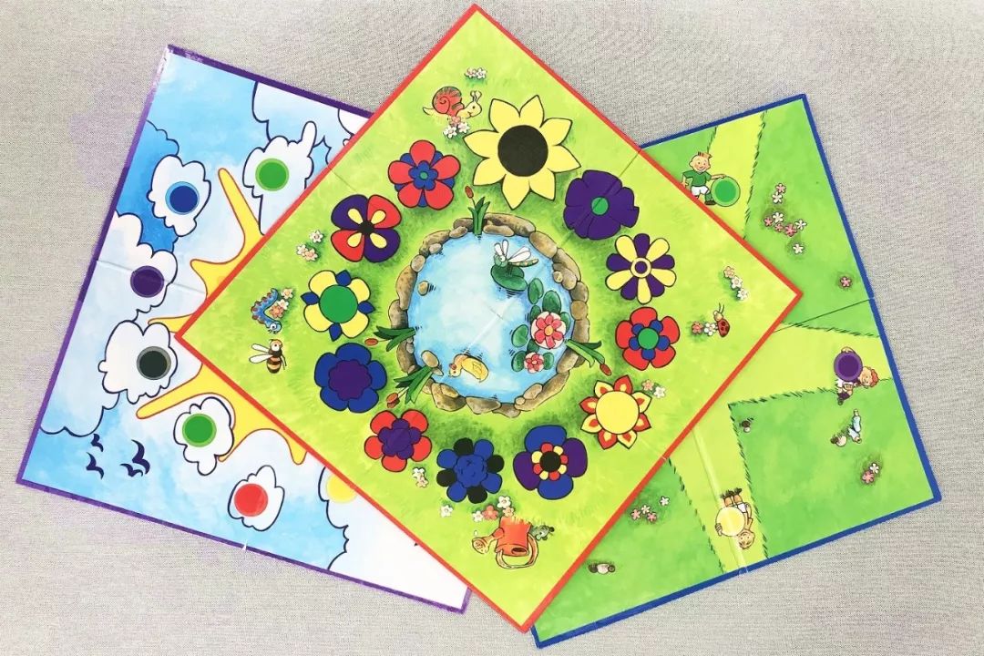 适合年龄:4+锻炼能力:观察判断力、抗风险的能力游戏道具:1块游戏板(花园板),两个骰子、六种颜色的棋子各1个(当做标记石头)、6种颜色的圆片(当做蝴蝶)。游戏规则:以向日葵作为起始花朵,掷骰子移动蝴蝶,蝴蝶沿着顺时针从一朵花飞到另一朵花上,哪只蝴蝶是第一个飞完一圈回到向日葵,哪个玩家就获胜。