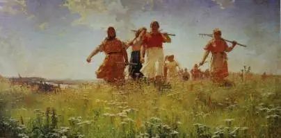 所以此时安德烈·梅尔尼科夫的画作也对当下国家需要发展农业的一种暗示,画面中一群妇女肩扛农具,整体画面为暖色调所要表现的也是这个国家中受到战争伤害的亲人们,她们的坚韧与乐观,所以这幅画作也是一幅代表了国家对战后妇女们的赞歌。