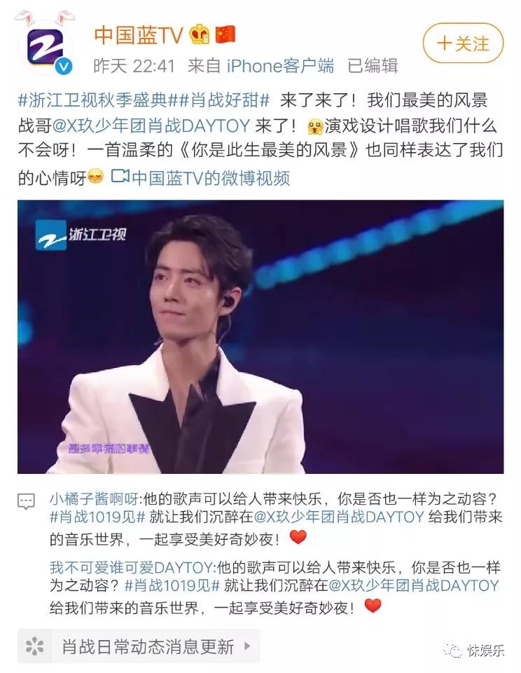 2019年10月19日晚,浙江卫视的秋季盛典,请了娱乐圈诸多的明星艺人登台表演,全都是有头有脸的艺人,然而肖战也为此向公司请假去参加受邀请的浙江卫视的秋季盛典晚会,肖战一定是特意为了自己的偶像请假赴往浙江秋季盛典晚会的,才得知肖战原来也是有自己偶像的。