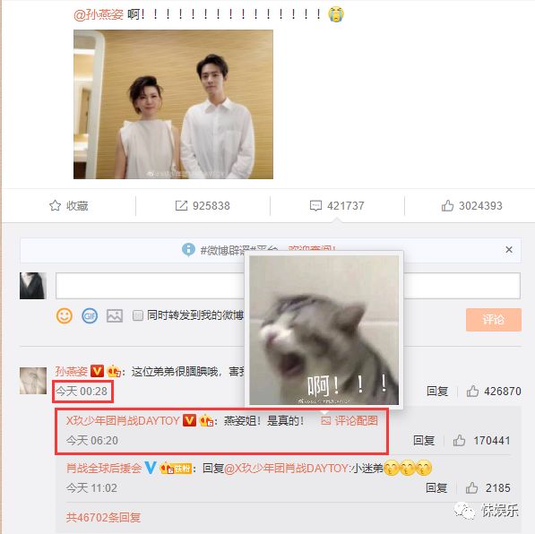 在孙燕姿回复后,可是有谁注意到燕姿姐是凌晨回复肖战的?而且还是00:28分回复的,已经很晚了,小编都睡了,或许小编之前的想法并不是大胆的噢!肖战估计是是去休息了,第二天早上起来6:20肖战又回复了孙燕姿,“燕姿姐!是真的!还配有一张啊!!!猫咪的配图”心情一定也是特激动的。