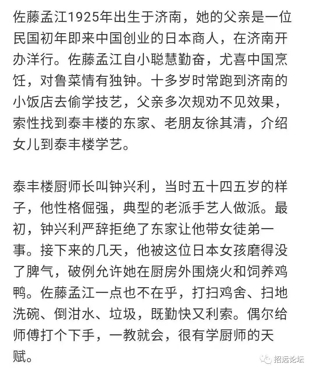 随着时间的推移,钟兴利越来越认可这位女徒弟。可老规矩不允许女人进后厨,钟师傅只好让佐藤孟江女扮男装上灶。从1942年—1948年4月,六年多时间,厨师长钟兴利手把手教会了佐藤孟江如何做鲁菜。日本投降后,佐藤孟江一家不得不撤回日本。回国前,钟兴利和他的伙计带着厨具、食材赶到女徒弟家中,大家一起动手,做出了六十八道菜。给女徒弟留下了浓浓的师徒情谊。