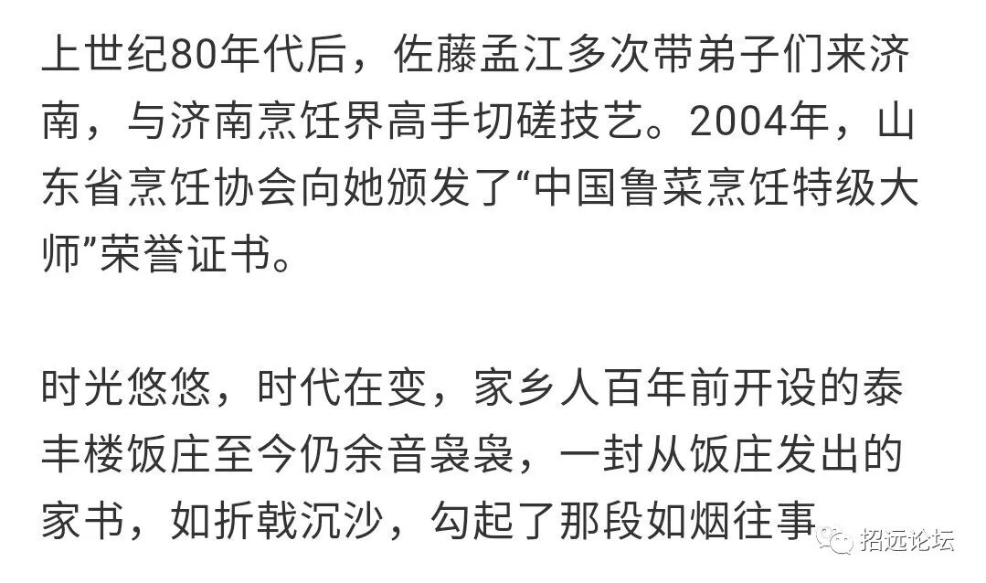 佐藤孟江回国后,在东京创办了济南菜馆,并开设烹饪教室,使鲁菜在日本发扬光大,并得到日本民众认可。2005年她与丈夫合著的《鲁菜情缘》一书在中国出版,这本真实细腻的著作,为济南人探寻泰丰楼的历史打开了新的时光隧道。