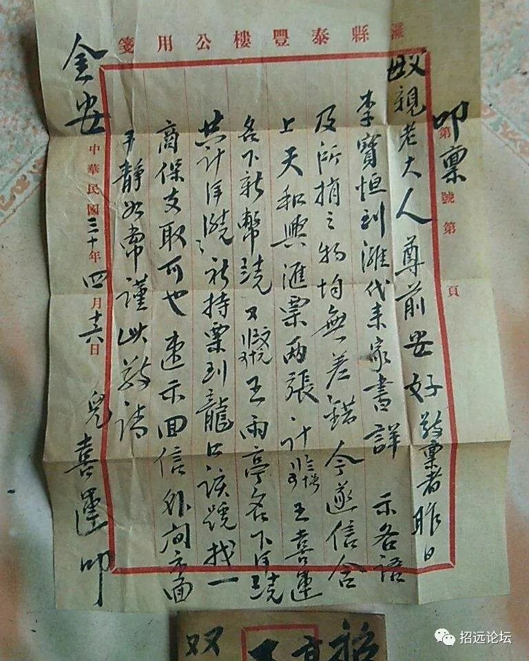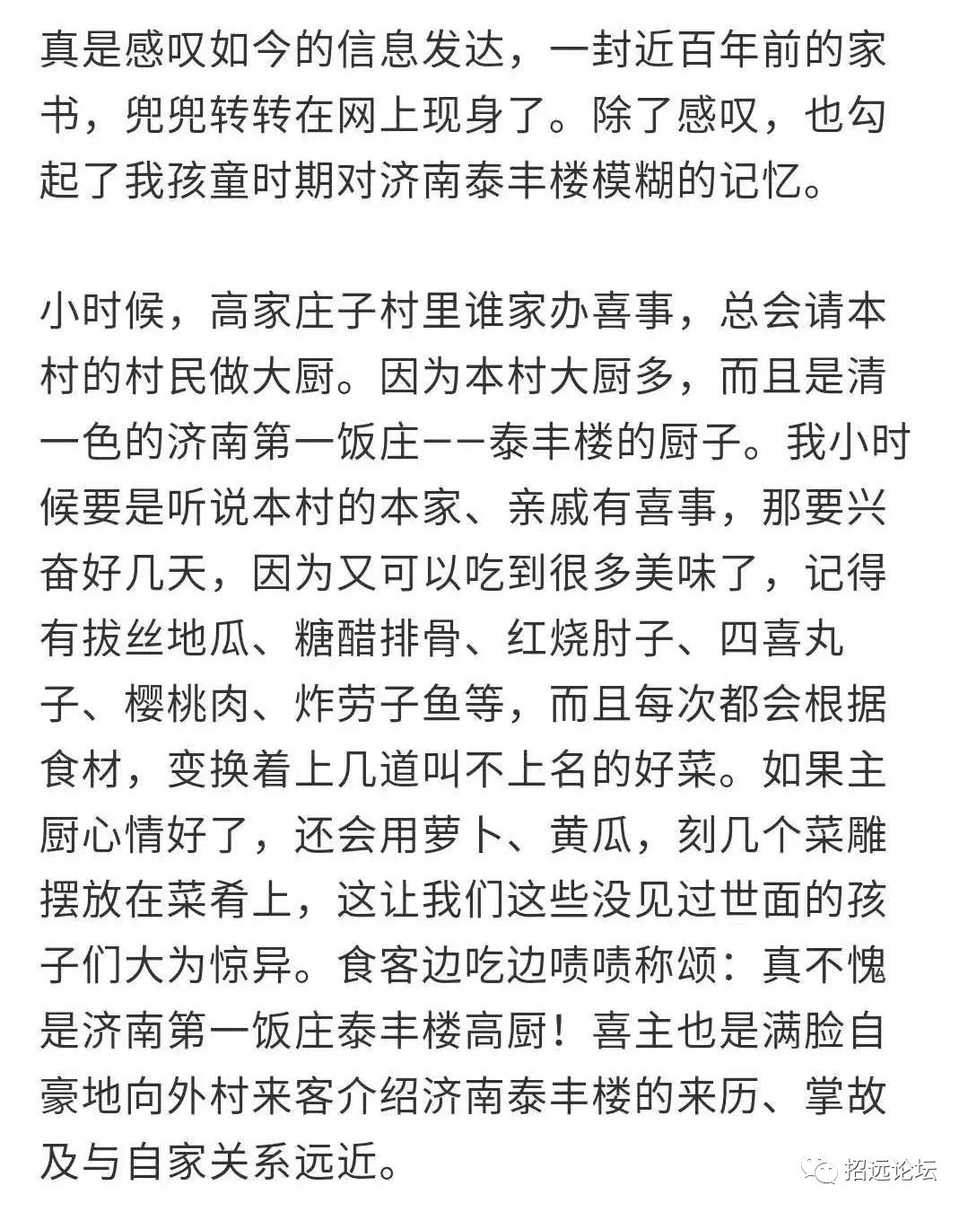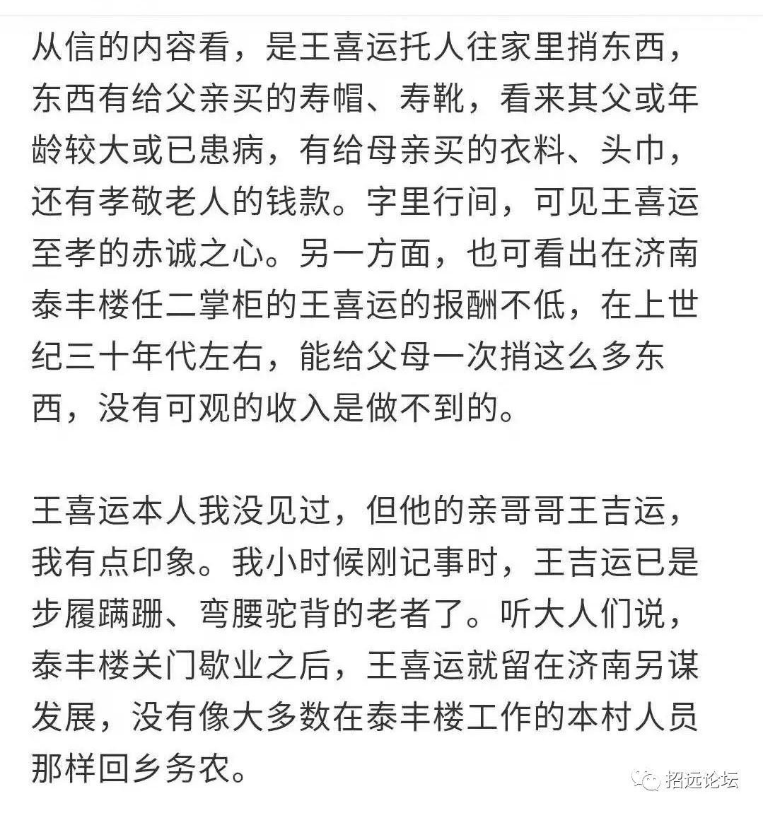 前几天,在互联网上浏览,忽然一个标题引起了我的注意:民国济南泰丰楼饭庄寄招远高家庄子王喜运信函一封。这是旧藏网上拍卖旧信函的一个标题。赶忙进网查看了信函的详细内容,基本断定,这封信就是我村在济南泰丰楼工作的王喜运给父母的家书,几经具体落实,确定此信函真实无误。