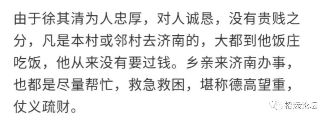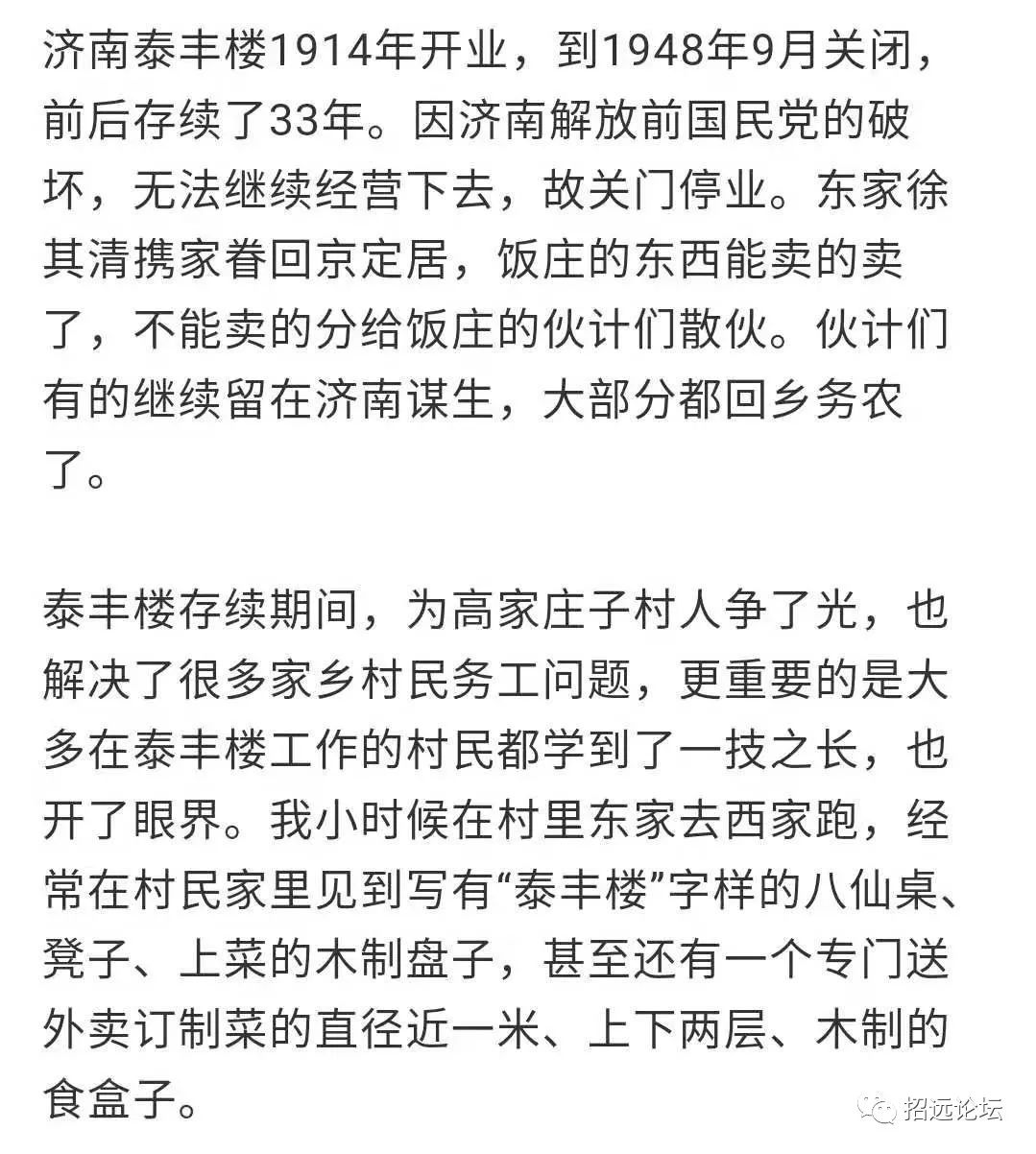 济南泰丰楼饭庄,于民国三年(1914年)开张,地址位于济南市老火车站附近,经二路纬五路西胡同内,东家是招远高家庄子村徐其清。有两个院落,可摆300余桌酒席,厨师、跑堂的及杂役等共有百余人,是全济南最大的饭庄。1984年出版的《济南饮食行业志》记载,泰丰楼经理为徐镜海,许多存留的泰丰楼记录,也称镜海先生。查阅徐氏家谱,镜海是徐其清的字,大名为徐其清。民国初年,人们为了表示尊敬、关系密切,一般以字相称。传来传去,济南与徐其清关系密切的各界朋友,只知其叫镜海,而不知其大名。