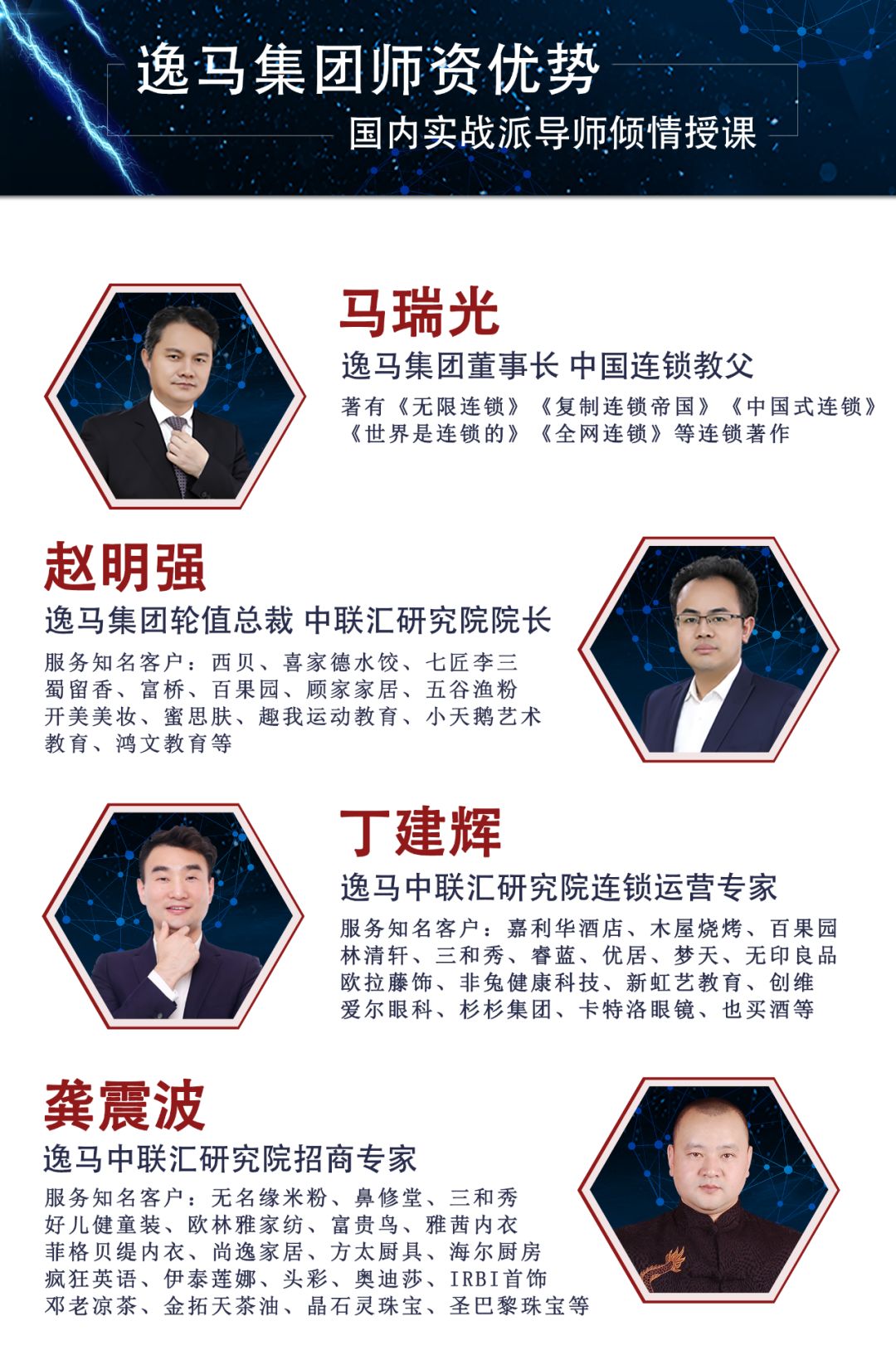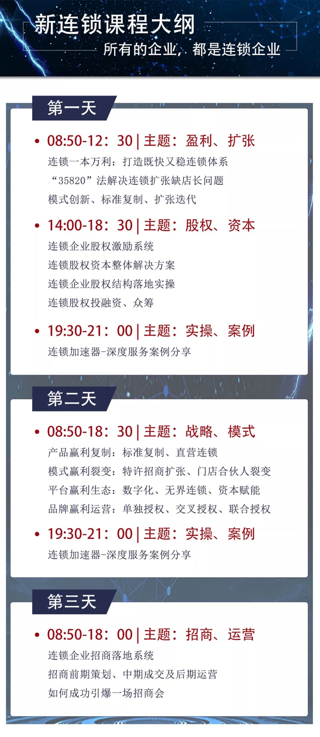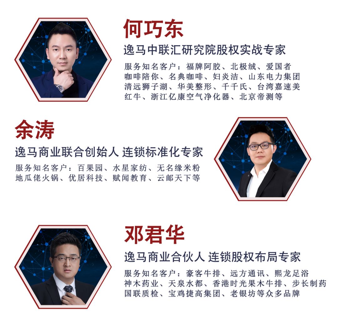 课程收获(1)系统思维——连锁经营系统、专业的思维+落地实操方法及工具(2)经济效益——激活创新思维,重构经营架构,实现经济效率骤增(3)资源对接——拓展商业人脉,连锁界精英互通有无,资源、项目跨界跨行对接(4)圈子文化——连锁联盟的大圈子,打造你中有我、我中有你的连锁大联盟