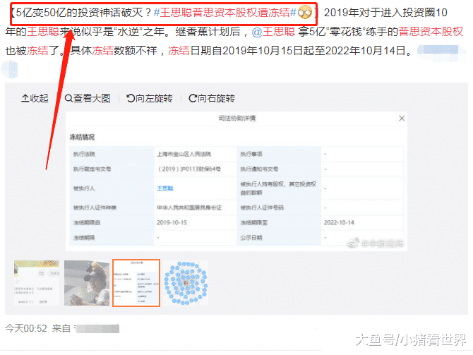 不过,今年以来,王思聪似乎有点背,先是自己一手创办的熊猫直播,因资金断裂而倒闭了,让他陷入投资失败的低谷。近日,又被媒体报道王思聪的普思资本公司资产正式被冻结,据悉这一次被冻结的资产为8445万元,其名下多家公司宣布破产。换句话说,王思聪当年的5亿投资正式宣布失败了。对此,不少网友调侃:一夜之间损失50亿?资产被冻结,以后还吃得起1万5的料理嘛?