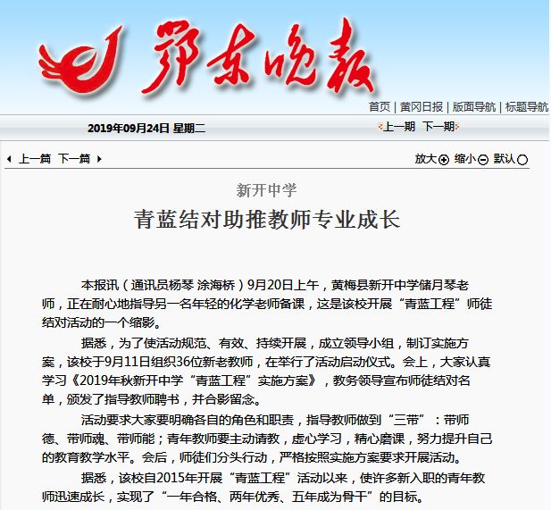 9月20日上午,黄梅县新开中学储月琴老师,正在耐心地指导另一名年轻的化学老师备课,这是该校开展“青蓝工程”师徒结对活动的一个缩影。本期来,为了发挥骨干教师的引领作用,迅速提高新教师的专业素养,打造一支高水平的优秀教师队伍,继续开展“青蓝工程”师徒结对活动。为了使活动规范、有效、持续开展,成立领导小组,制订实施方案,并与9月11日组织36位新老教师,在二楼会议室举行了活动启动仪式。会上,大家认真学习《2019年秋新开中学“青蓝工程”实施方案》,教务领导宣布师徒结对名单,颁发了指导教师聘书,并合影留念。活动要求大家要明确各自的角色和职责,指导教师做到“三带”:带师德、带师魂、带师能;青年教师要主动请教,虚心学习,精心磨课,努力提升自己的教育教学水平。会后,师徒们分头行动,严格按照实施方案要求开展活动。本次活动凸显出一大亮点,就是储月琴、程蕾等5位青年教师成长迅速,前两年自己还是“青蓝工程”活动中的徒弟,现在已被聘任为指导教师了,充分显现出了“青蓝工程”对引领新教师专业成长所起的作用。