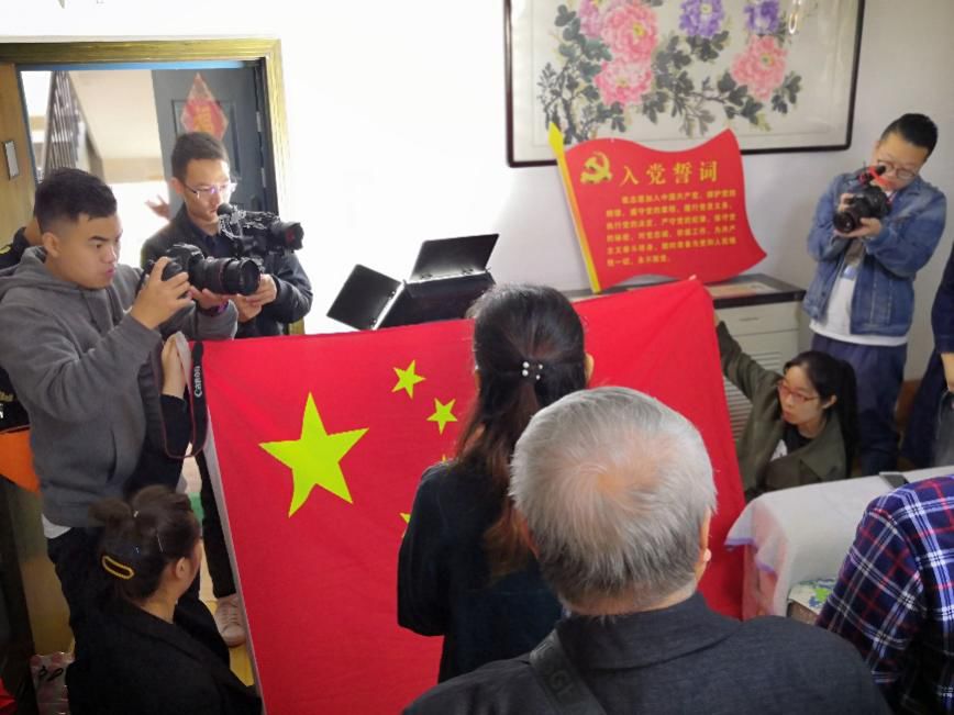 在场党员面向国旗合唱《中华人民共和国国歌》
