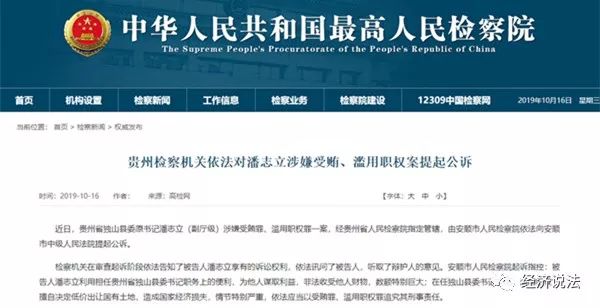 2019年8月12日,据最高人民检察院官网消息,贵州省黔南州独山县委原书记潘志立(副厅级)涉嫌受贿、滥用职权一案,由贵州省监察委员会调查终结,移送检察机关审查起诉。经贵州省人民检察院指定管辖,由安顺市人民检察院审查起诉。安顺市人民检察院依法以涉嫌受贿罪、滥用职权罪对潘志立作出逮捕决定。案件正在进一步办理中。