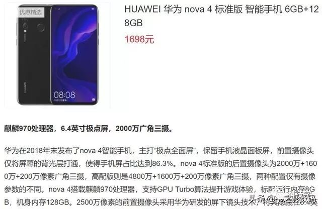 时至今日,6+128GB版本的华为Nova4已经被下调至了1698(价格来源为X猫)。那么,如今的它性价比如何呢?先来简单看看它的配置。华为Nova4是一款搭载麒麟970处理器的手机,正面的挖孔LCD屏,背面有后置指纹识别和竖排三摄,三摄规格分别为2000万像素主镜头(标准版)+1600万像素超广角镜头+200万像素景深镜头。