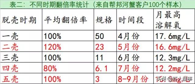 如上表,合理的密度将会显著的提升河蟹的翻倍率和生长规格。