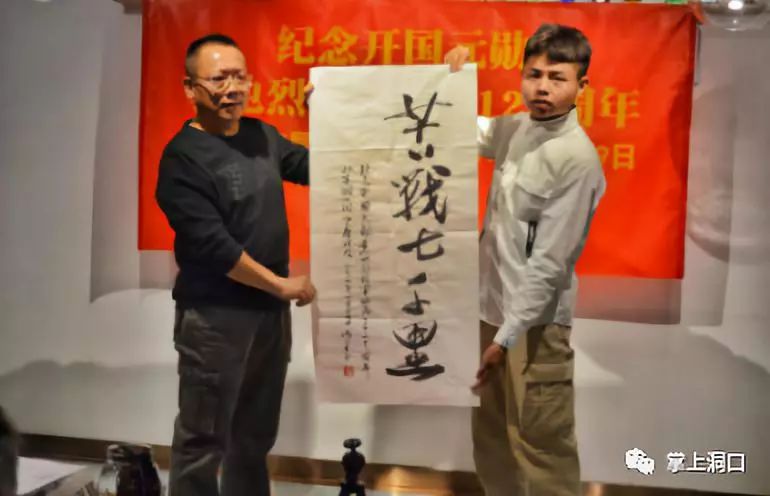 ▲湘人李向袁也烈故居赠送“苦战七千里”书法作品,以纪念袁也烈将军转战广西十万大山的峥嵘历史。曾祥代表同乡接礼。