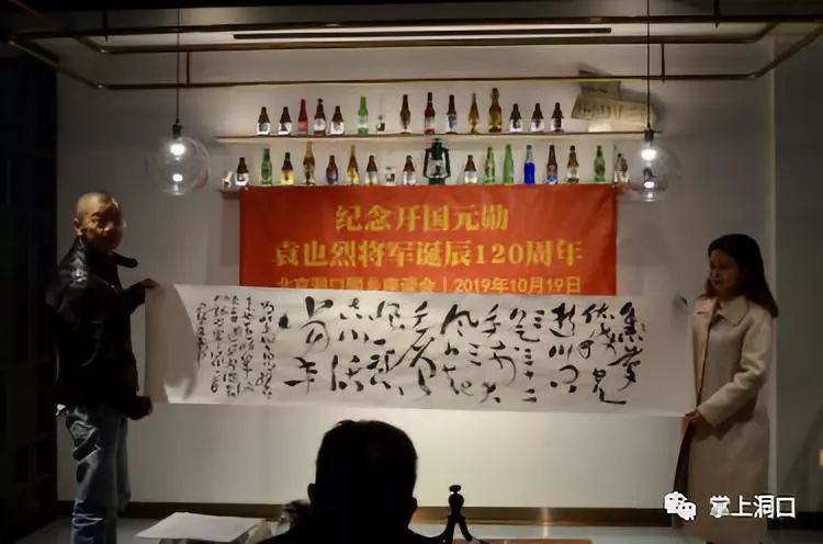 ▲司马平邦狂草书法摘抄袁也烈将军诗歌:“旧梦依稀咒世川,问题三十二年前。大风吹起千层浪,一凭赤心话当年。”曾露葵代表同乡接礼。
