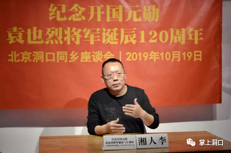 ▲同乡湘人李,资深媒体人。他认为,“应该以我们的洞口同乡袁也烈将军为开始,以‘史家胡同十一号’作为一个产品符号,研究和创作袁也烈将军在北京的一部书籍,然后研发一个电影产品,最后拍一部电视剧,还有相应的纪录片,还可以排一部话剧。我们今天在史家胡同自发举办‘纪念开国元勋袁也烈将军诞辰120周年北京洞口同乡座谈会’丰富了我们洞口先辈的精神,也丰富了我们湖南先辈的历史人文价值和意义,同时也创造了属于我们自己的历史。也许50年以后,100年以后,我们的后人也会到史家胡同来开座谈会,他们或许会说道:50年前,或者100年前,我们的一群洞口先辈,一群湖南先辈,在史家胡同,巷左转巷右转咖啡馆,开了一次座谈会,他们创造了一个很牛逼的历史。”