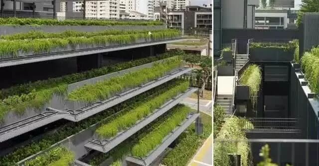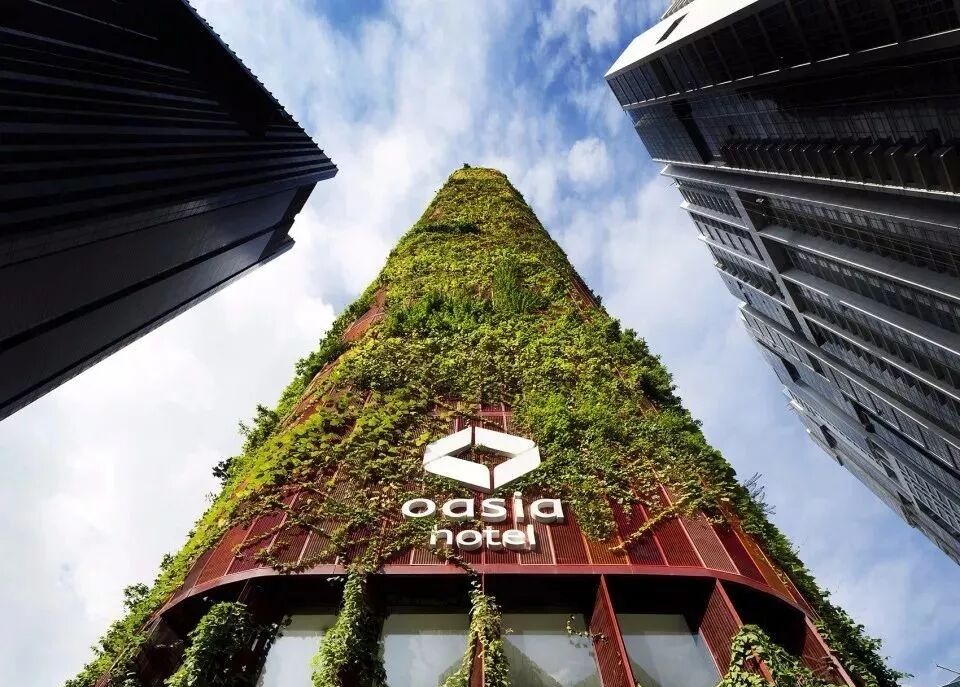 Oasia酒店位于商务办公区之中,建造前的最大课题是怎样在周围10栋玻璃幕墙的办公和酒店大楼中脱颖而出。WOHA建筑公司运用红色为基调在玻璃幕墙的办公大楼之间打造了一个垂直绿化建筑不仅仅为此区域增加了生机更为动物与昆虫营造了空中住所与栖息地,在减少建筑能耗的同时做到了生物链的完全循环,成为绿色建筑之典范。
