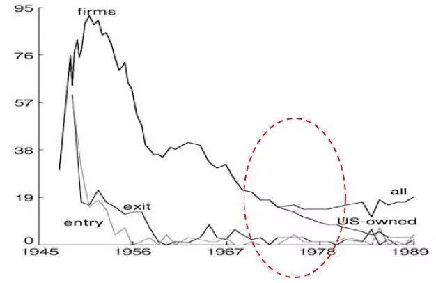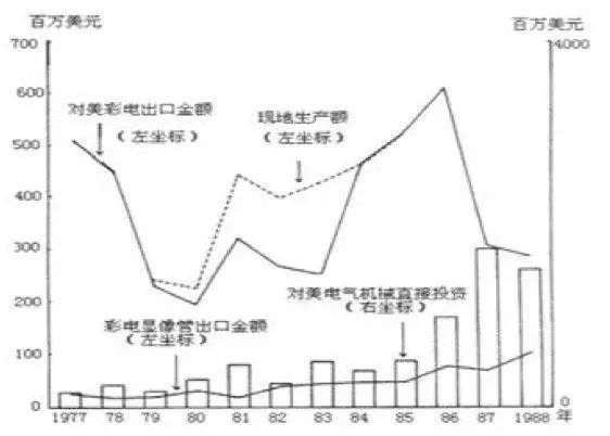 2、70-80年代的反超:进入70年代,日美贸易摩擦不断加剧,1977年美国迫使日本接受电视机出口自主限制,规定1977-1979年每年只能向美国出口175万台电视机,但在美生产的电视机不受限制,同时随着日元持续升值,70年代末到80年代日本企业在美国掀起了直接投资设厂的浪潮,以规避贸易与汇率风险。
