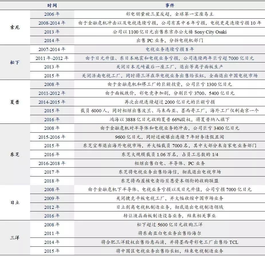 外部竞争加剧、内部战略错判,叠加2007-2012年日元持续升值、消费电子等相关领域的落伍等因素,最终导致日本黑电企业雄风不在、连连巨亏,目前日立、东芝、三洋已经变卖资产彻底退出彩电市场,夏普被鸿海收购,松下退守本土,仅索尼在高端市场坚守。
