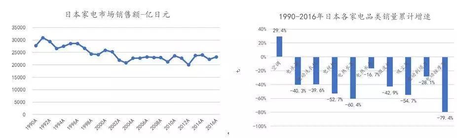 根据日本电机工业协会(JEMA)统计,1990-2016年日本家电行业出货金额由2.77万亿日元下降到2.32万亿日元,累计下降16%。