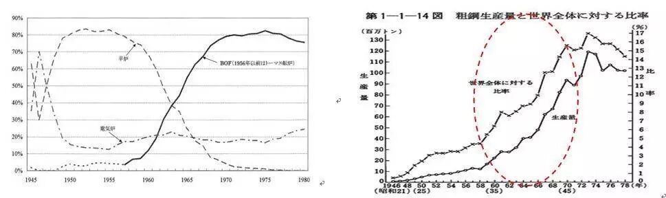 随着转炉炼钢逐渐取代平炉炼钢,日本钢产量不断增加