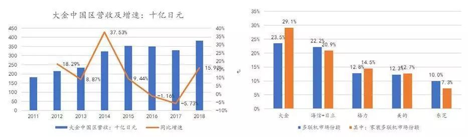 得益于对中国市场尤其华东地区的深耕,大金一直占据国内多联机市场第一位置,虽然在2016-2017年由于渠道调整影响中国区收入增速有所放缓,但随着近年国内家用中央空调需求崛起,总体上大金中国区业务仍实现较快增长。