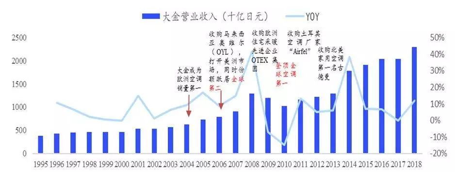 与此同时,大金的海外本土化运营与外延收购并举,使其国际化大获成功。其中在美国的两次成功并购使其位居美国空调市场第二位。