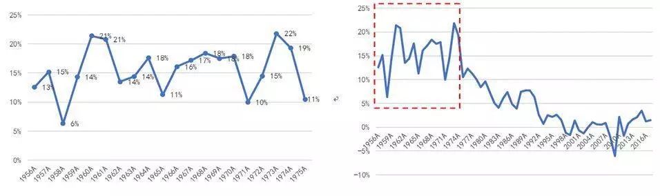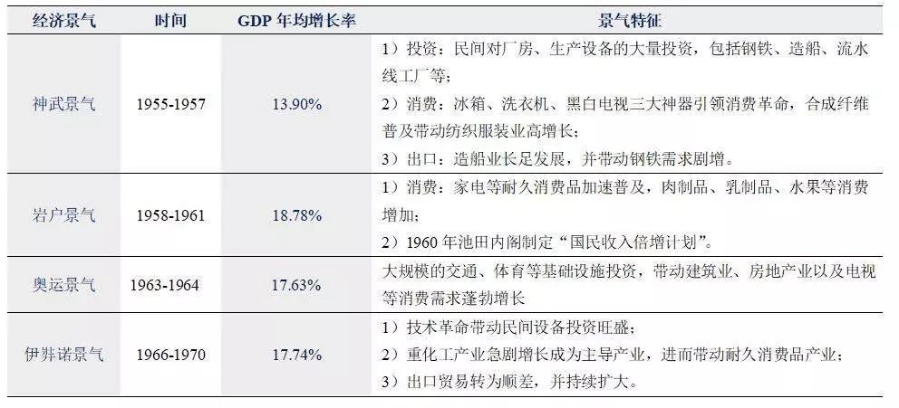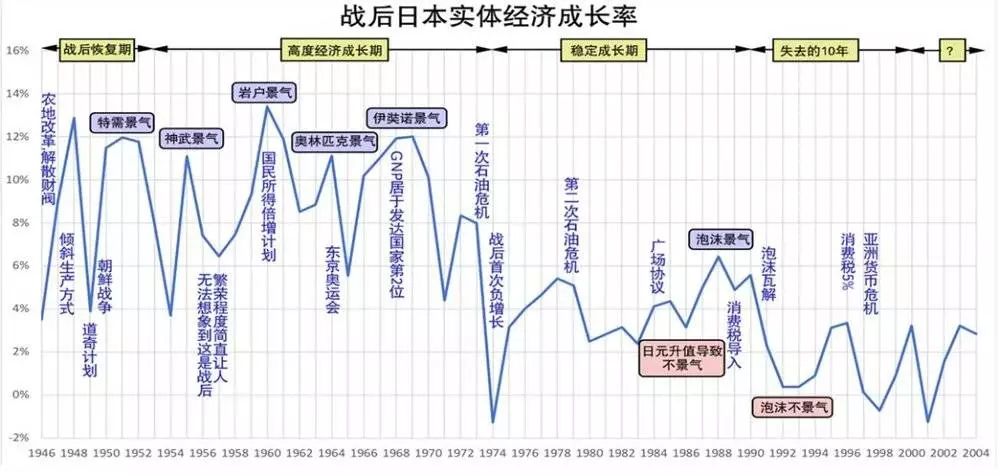 经过朝战特需经济刺激,50年代中期日本经济恢复到战前水平,此后一直到1973年第一次石油危机,在连续4轮景气周期带动下,日本经济实现了近20年10%以上增速的高速增长。
