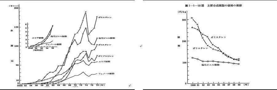 60年代主要的合成树脂,产量(左)上升,价格(右)下降
