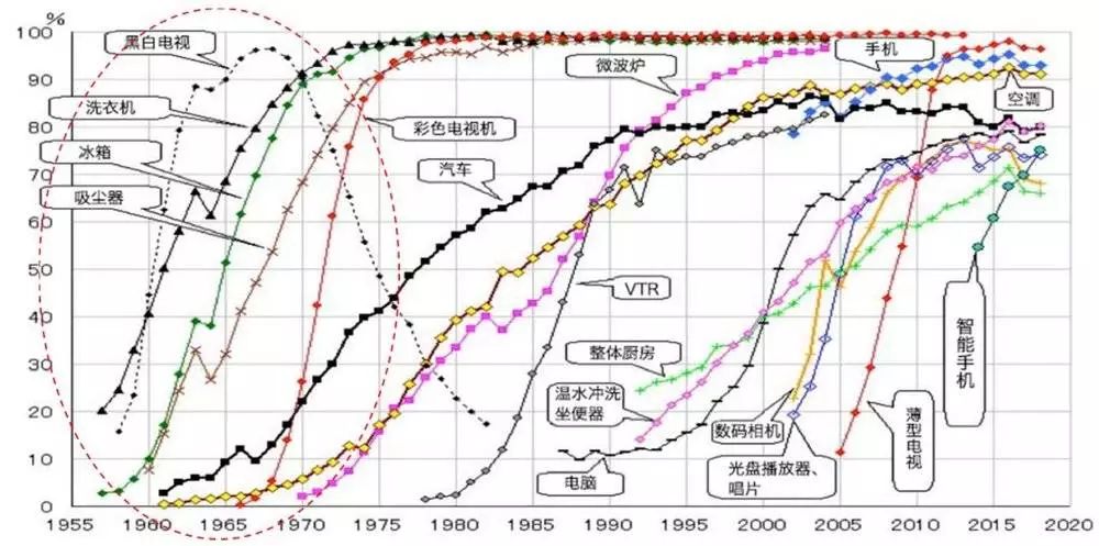 1955年之后日本家电步入加速普及,到70年代大家电基本完成普及