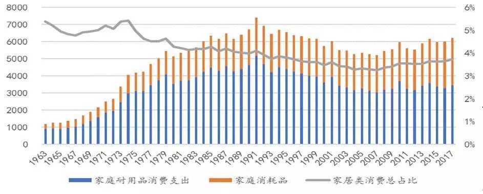 在城市化浪潮、小家庭占比提升的大背景下,60-70年代日本消费者支出以衣食、住房与家居类为主,家居类占总消费支出的比重稳定在5%左右,自1975年开始家居类支出占比才有所下降,其中以家电为主的家庭耐用消费品支出绝对额继续保持稳定增长。