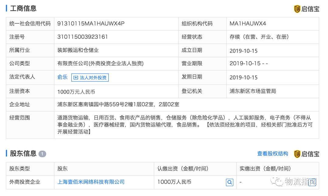 启信宝数据显示,上海柿柿顺物流有限公司成立于10月15日,由叮咚买菜运营主体上海壹佰米网络科技有限公司投资成立,注册资本1000万元,法定代表人为俞乐,监事为梁昌霖,而梁昌霖正是叮咚买菜的创始人兼CEO。