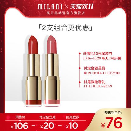 【2支装】milani小金管口红学生款套装滋润显色不沾杯豆沙色唇膏