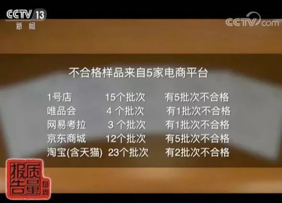 通过数据可以看到,在所有五家被抽查的电商平台中,淘宝(含天猫),23个产品批次中,有2批次不合格,不合格率为8.69%,低于平价值24%,同时91.31%也是所有被抽查的五家电商平台中合格率最高的。