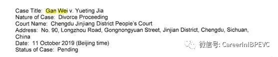 10月20日,曾与贾跃亭有过诉讼历史的顾颖琼曝光了一份法庭文件,文件中显示,2019年10月11日贾跃亭和甘薇已经在成都锦江区人民法院申请离婚,该申请的状态是处理中。