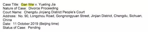 10月20日,记者从贾跃亭个人破产重组申请的其中一份文件《Schedules of Assets and Liabilities and Statement of Financial Affairs》中看到,这份文件列出了贾跃亭目前所面临的诉讼情况。其中提及,贾跃亭和妻子甘薇在2019年10月11日于四川成都锦江区人民法院申请离婚,案件状态为Pending,即审理中。