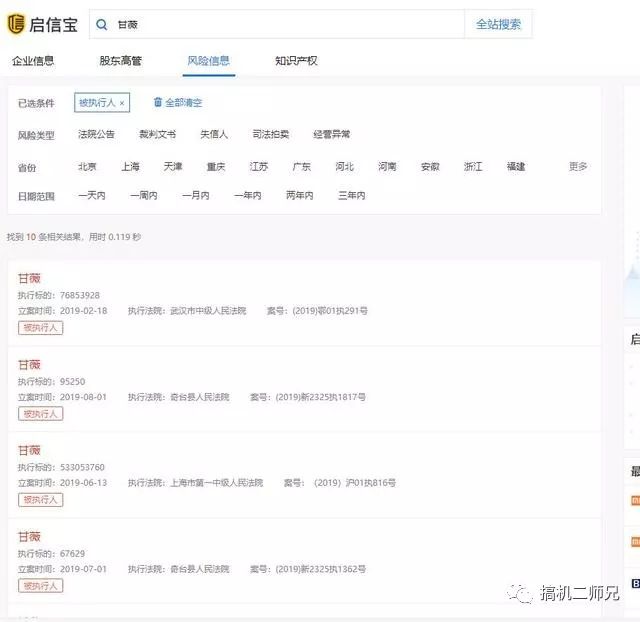 而且虽然离婚了,贾跃亭的家庭也难以得到平静,来自启信宝的数据显示,甘薇目前还是老赖(失信被执行人)的身份,身上有十条被执行人信息,启信宝数据还显示,目前有多条与甘薇有关的关联风险,以她担任法人代表的北京乐漾影视传媒有限公司为例,其股权就被冻结,并且有官司缠身。根据最近9月19日的那份被执行人信息: