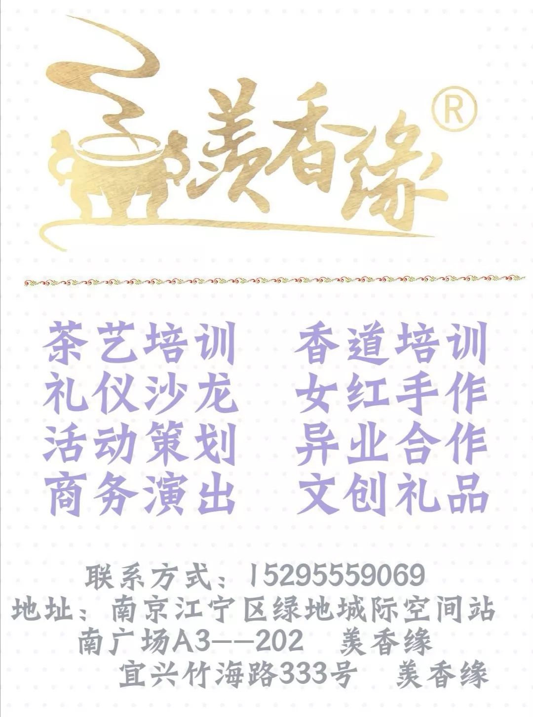 秉承“香以载道,以茶会友”的理念,将中华传统雅文化运用创新思维“在传承中求发展”致力于原创节目编创,传统文化培训,品牌产品研发,雅集活动策划。开设有:职业香道师、国家级茶艺师、少儿茶艺考级、少儿香艺考级等培训班及资格认证;宋人四艺、女子雅修、茶艺香道表演、手机摄影、形象设计等课程,已不同程度参与了全国天香使者香艺师大赛、第四届南京茶博会、上海全民饮茶日等大型文化交流活动的筹备与策划。我们静待志同道合之友人共赏茶事,同习香艺,为复兴中华雅文化尽一丝绵薄之力
