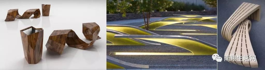 以片区三大核心建筑为中心“模拟”放映机轮盘,疯狂旋转发射彩带“胶片”彩带,串联景观节点并植入相关电影主题场景,途中胶片还在“自我变身”:加入LED在地面延伸可以有色彩变化有灯光闪烁,平地而起的胶片还能变“胶片”哈哈镜拱廊、座椅、垃圾桶……不仅组织了多样景观主题,同时还起到了统一风貌及商业动线导引的作用。