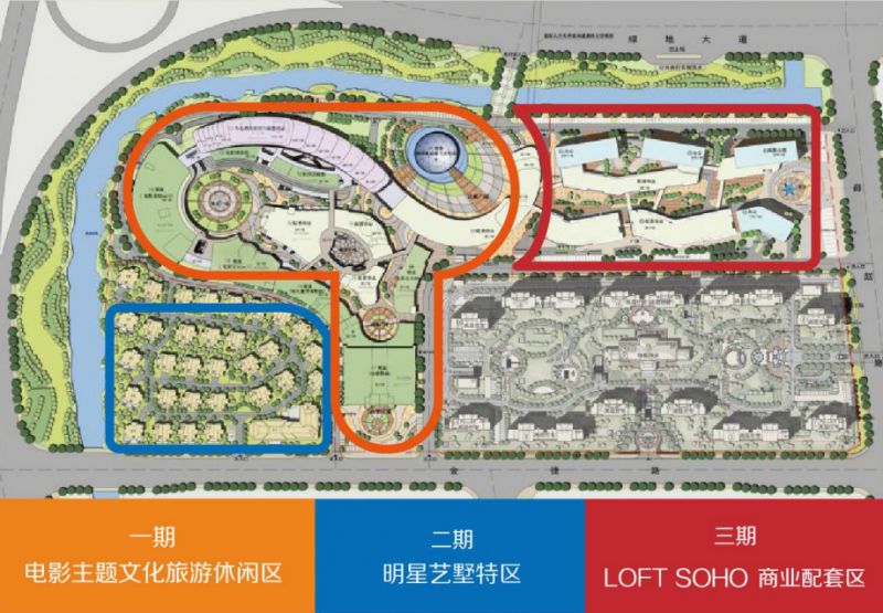 主要是以电影文化为主题的旅游休闲区,包括5D飞天影院、电影主题酒店,巨幕影院、儿童城堡、5D儿童影院,5D潜水影院、威廉古堡、奥莱世界、欢唱世界、无国界美食等。