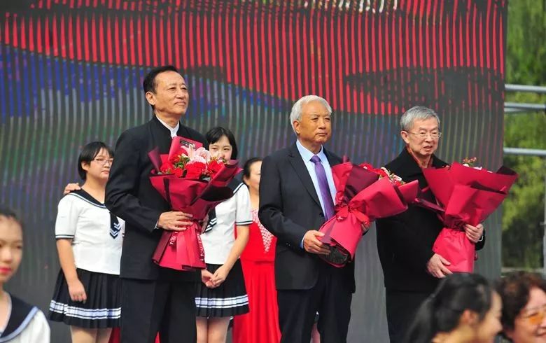 学生为老校长老教师献花,佩戴90周年纪念校徽!