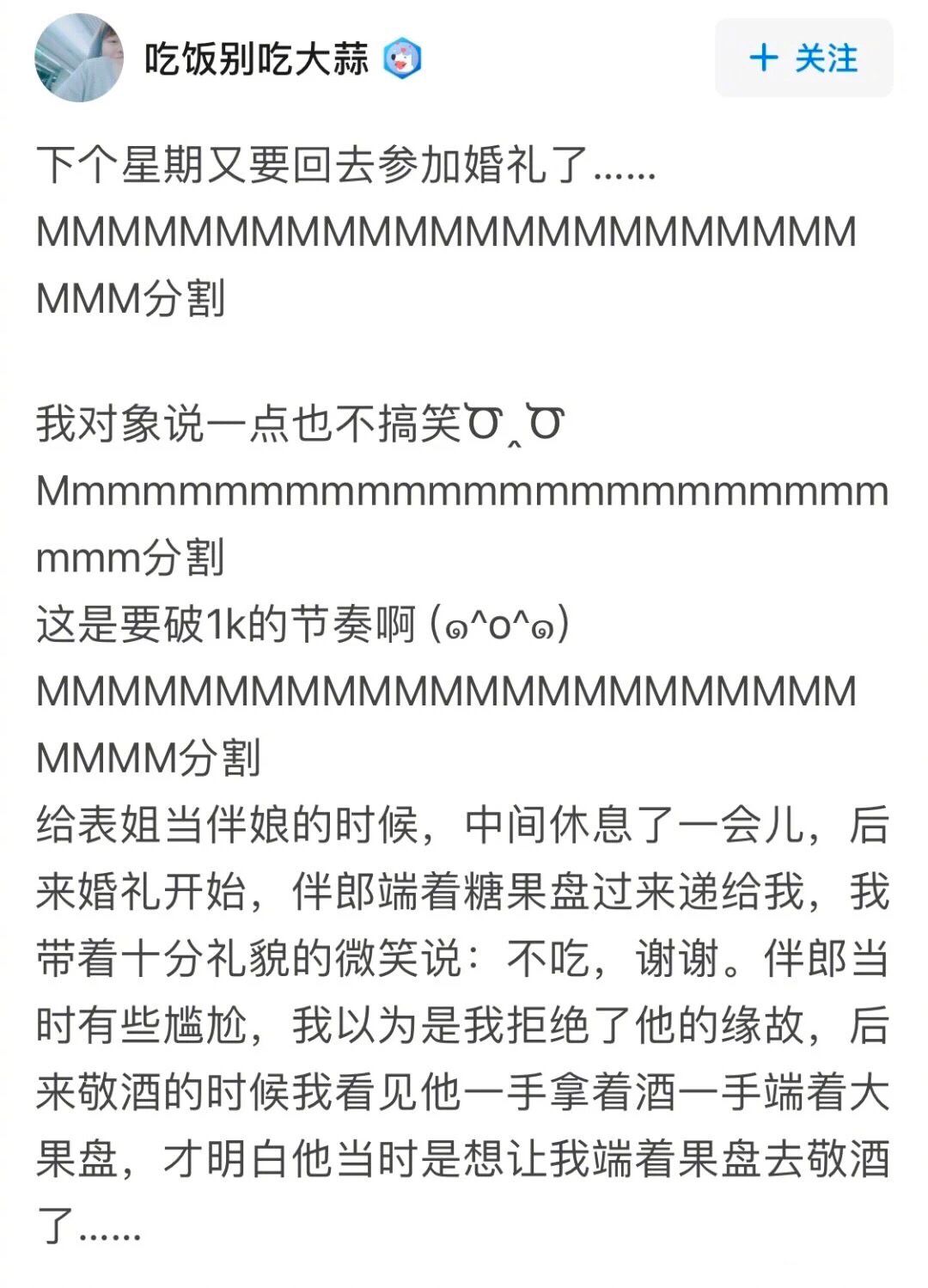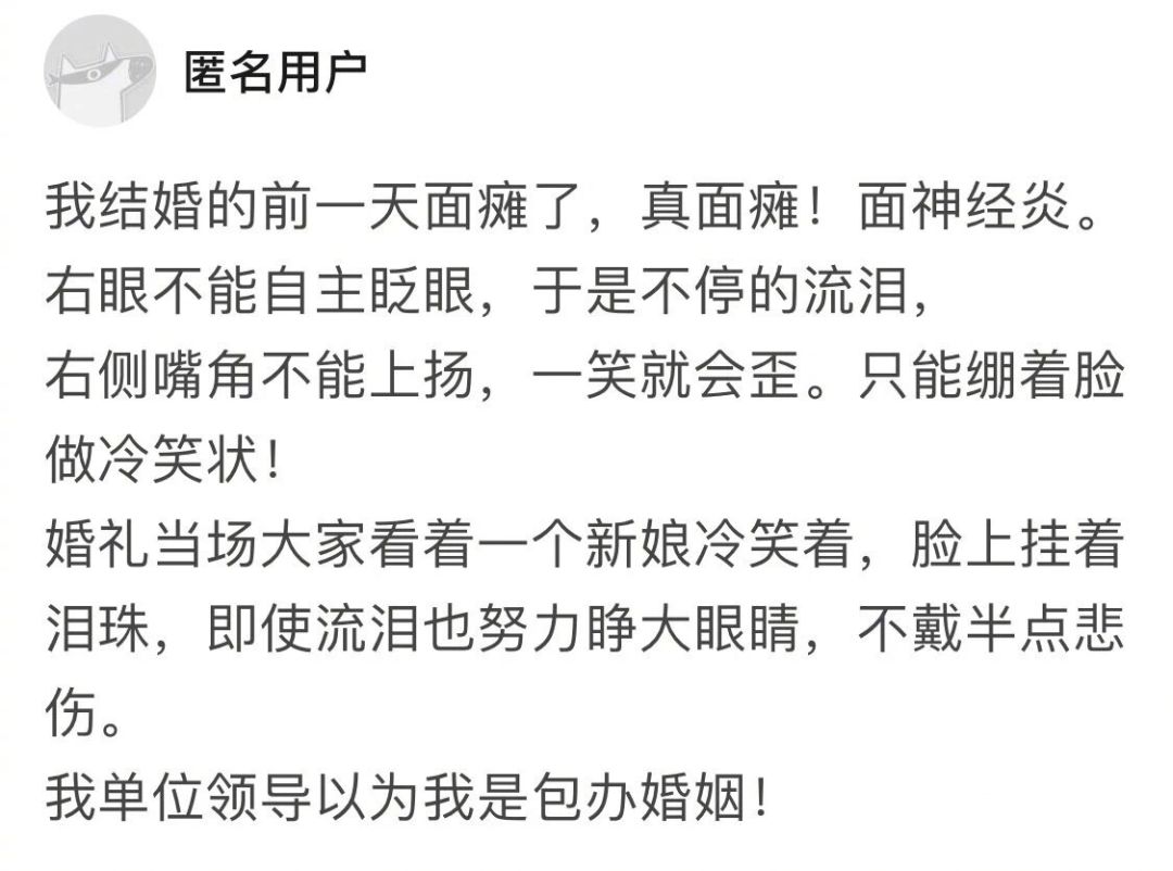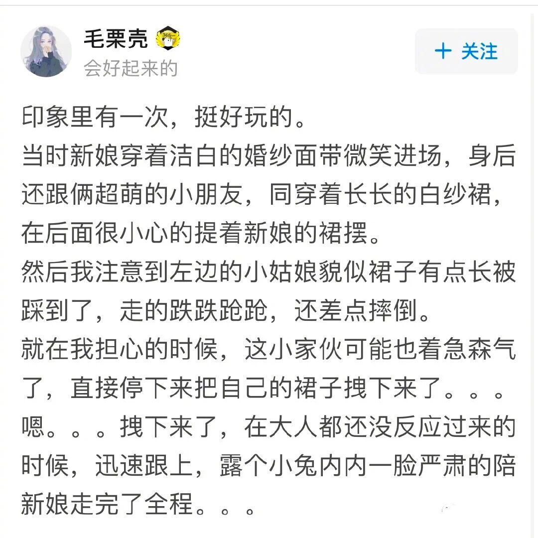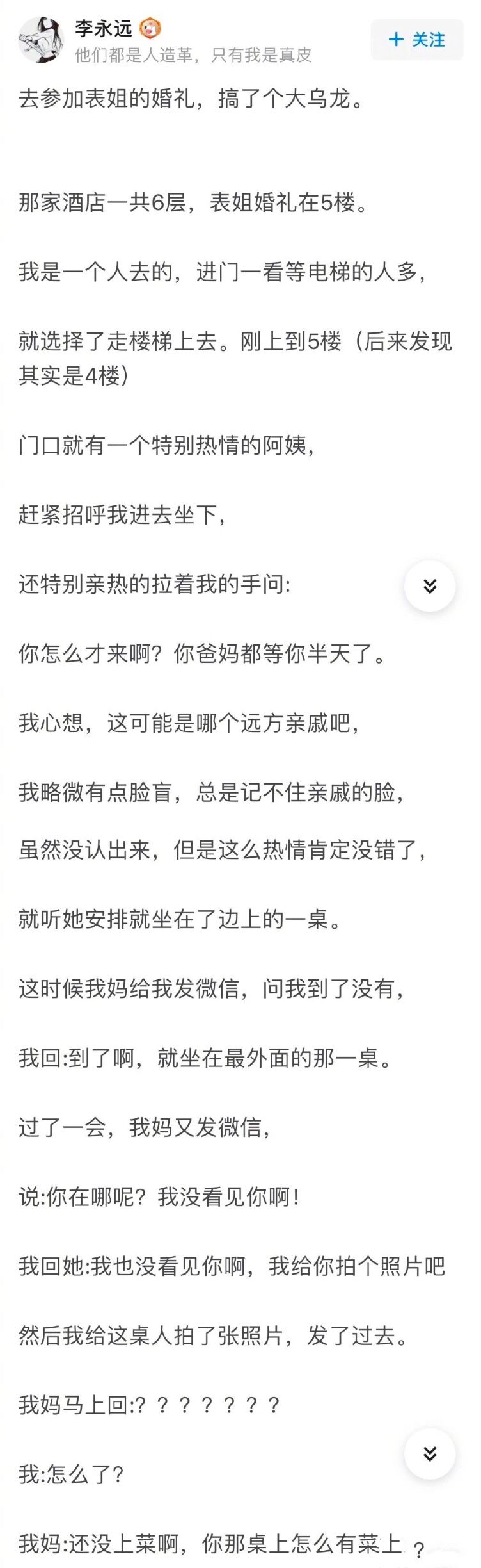 @卖火柴的小伪娘:我自己婚礼,结婚旺季加有名酒店,每个宴会厅都有正在进行中的婚礼,早上忙的一团乱我不小心上错楼层了,那层新人跟我选的同样色调的婚礼布置(宝蓝色)。那个宴会厅的来宾眼睁睁的看着一个打扮完整的陌生新娘带着一群伴娘姐妹冲进了他们要参加的婚礼!