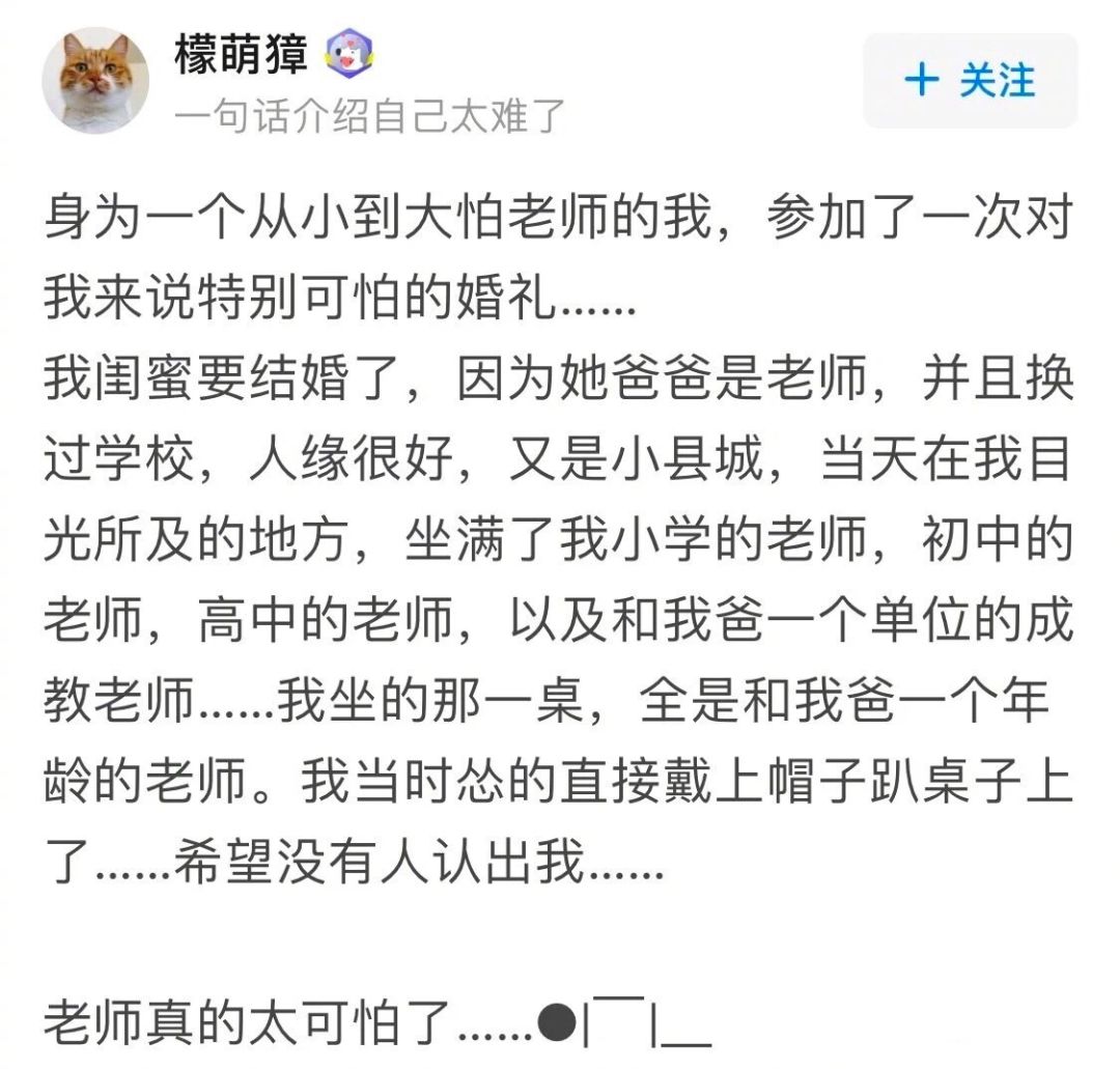@·三亿日元·:参加我妈一个表妹的婚礼,然后她老公是我初中校长的儿子。。于是吃饭那天隔壁桌坐着我的班主任、数学老师、语文老师……我还一一问候了一下,晚自习的时候我班主任悄悄把我拉到一边问我和校长什么关系