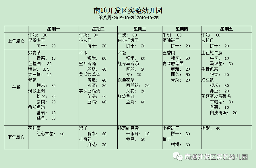 本周食谱——南通开发区实验幼儿园第八周儿童营养食谱