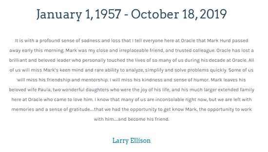马克赫德官方网站刊登了一封来自甲骨文CEO拉里-埃利森的信,信中说:”带着深深的悲伤和失落,我再次告知甲骨文的所有员工,马克-赫德今天早上去世了。马克是我亲密的、无可替代的朋友和值得信赖的同事。甲骨文失去了一位才华横溢、深受爱戴的领袖,他在甲骨文工作的十年间,触动了我们许多人的生活。我们都会想念马克敏锐的头脑和罕见的快速分析、简化和解决问题的能力”