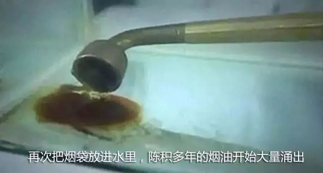 实验二:这是在农村专门找的一个抽了40年的老烟袋锅,首先我们把老烟袋锅放在水里,结果烟袋锅里面的烟垢却没有流出来,接下来我们把清烟宝密封在老烟袋锅上,点上烟,一支烟抽完后,再把烟袋锅放在水里,这时烟袋锅里流出黑黄的烟垢,这说明,清烟宝里的清肺雾,溶解了烟袋锅40年沉积的烟垢,所以它会流出来,可想而知,这些清肺雾进入到老烟民的肺里,那些积存多年的烟油毒垢自然片甲不留被清除。