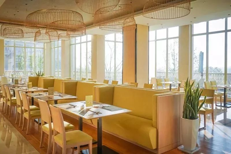 这家酒店,连餐厅都毫不吝啬地让你饱览山水风景!大面积的落地窗,把美景像画一样映在你眼里,在这里享用美食也太嗲~