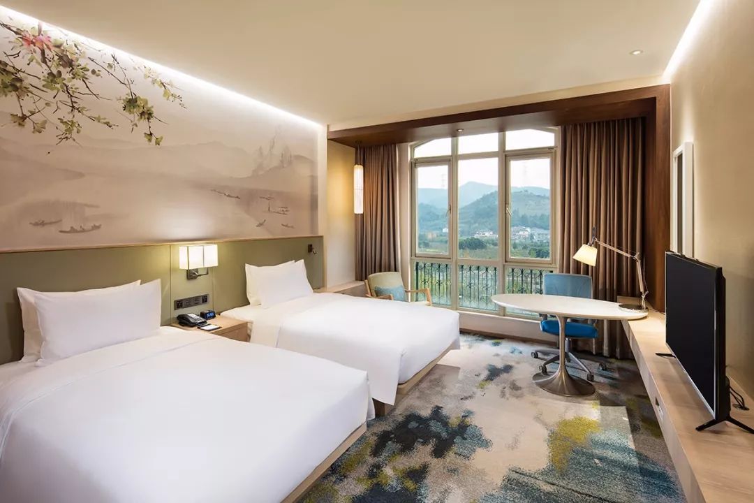 花园山景房里,一副诗意的江南水墨画设计为床头背景墙,就仿佛是窗外群山的衍生。配色、装饰都是养眼的温馨风格~